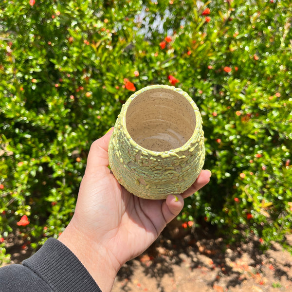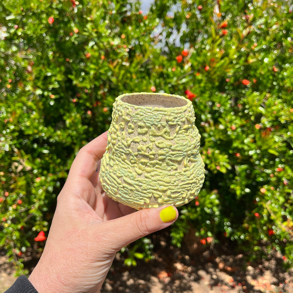 approx 3.75x3.75 curvy bud vase with a yellow and green glossy gloop glaze on the exterior and a glossy clear interior.